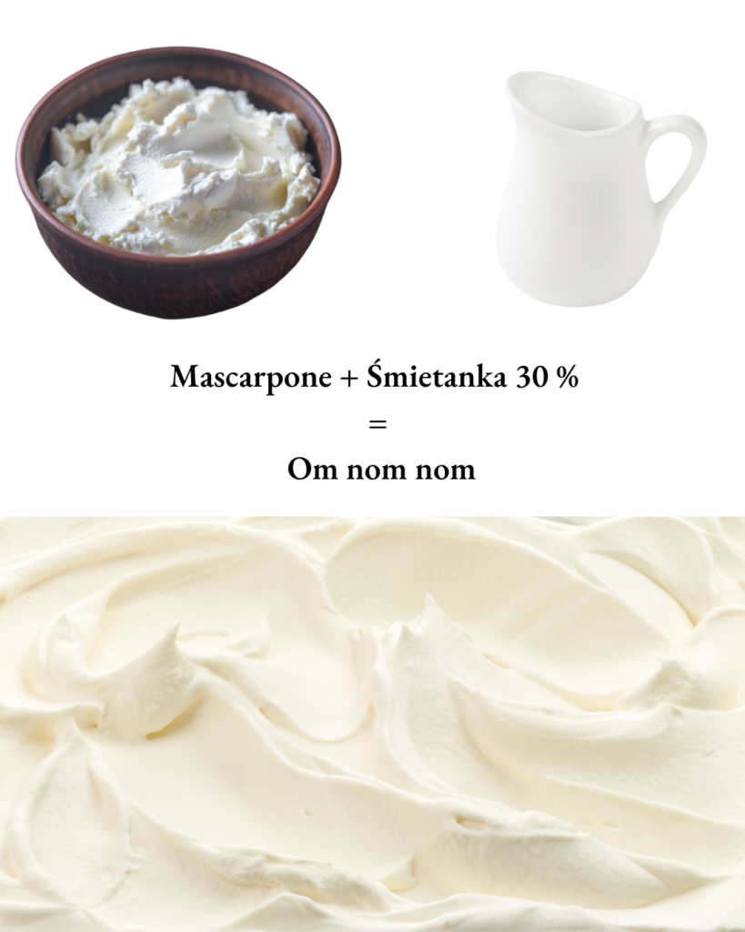 Mocno schłodzone mascarpone i śmietankę ubij na wysokich obrotach do uzyskania gęstej, puszystej masy (2–3 minuty w mikserze planetarnym).