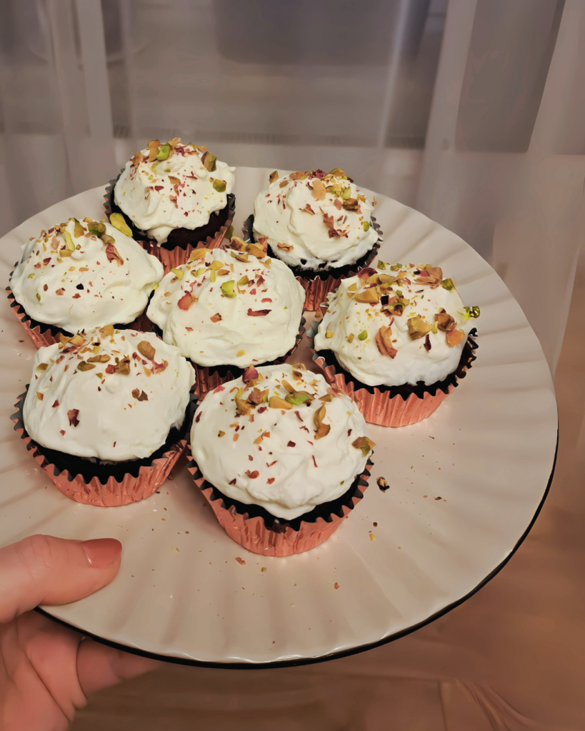 Dekoruj muffinki/ciasto/tort pokruszonymi pistacjami i suszonymi płatkami róży, owocami liofilizowanymi albo owocami granatu – i gotowe!
